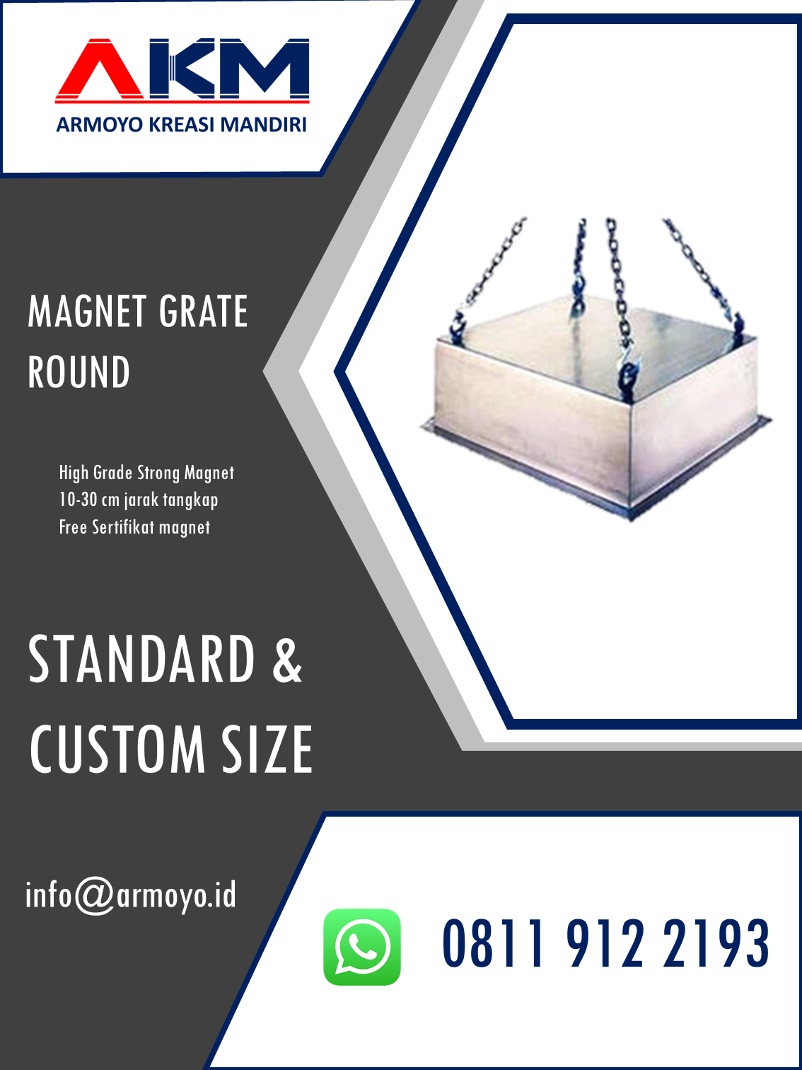 Berbeda dengan Magnet Plate biasa, Magnet ini memang peruntukkannya diletakkan diatas konveyor berjalan. Mampu menangkap logam-logam besar dari jarak 5 cm hingga 30 cm